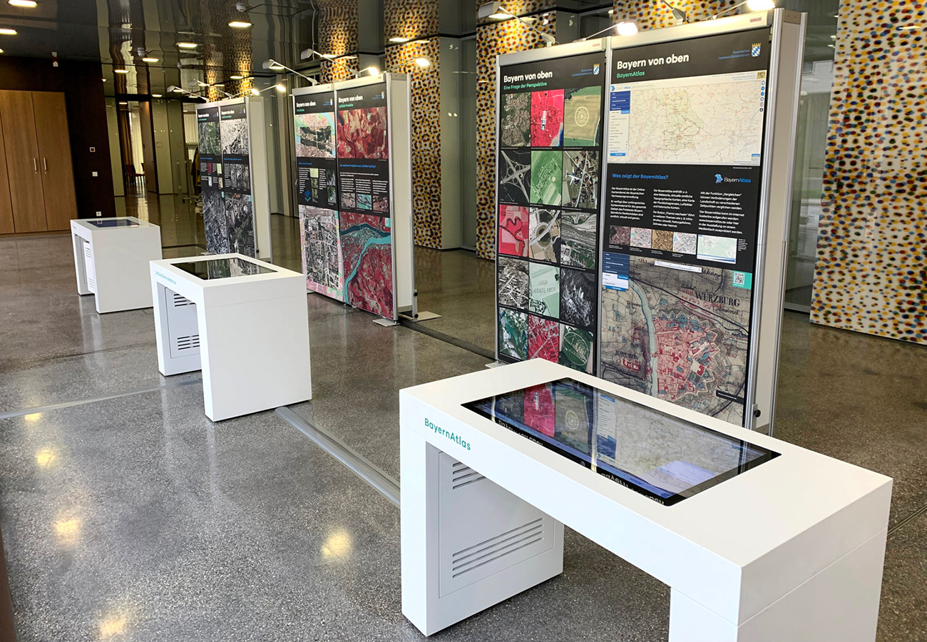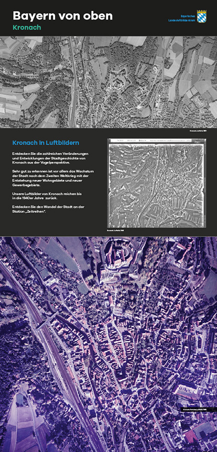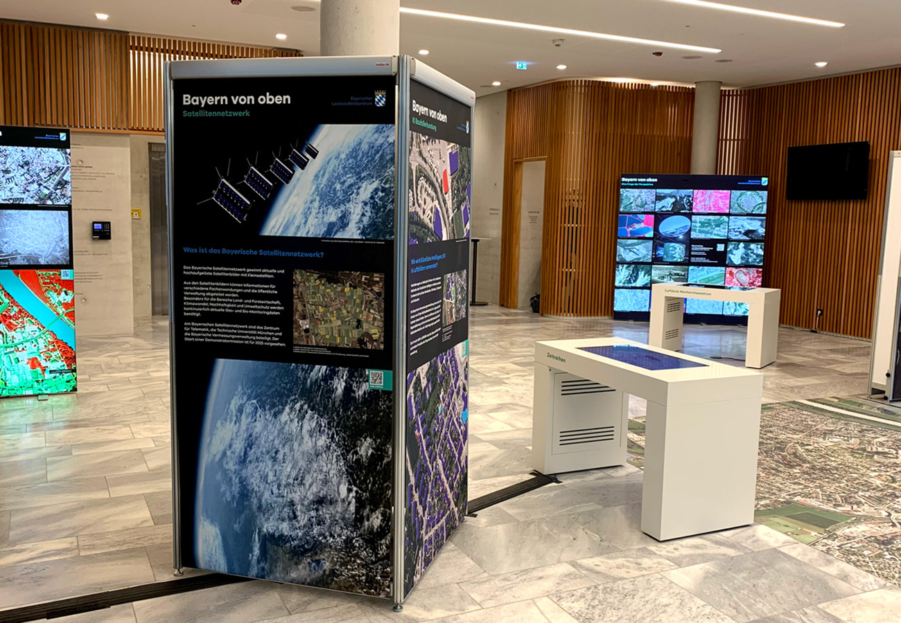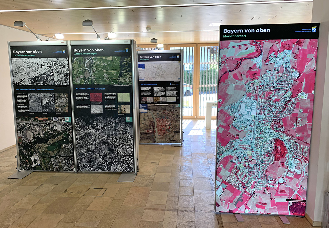 Anlässlich des fünfjährigen Bestehens des Bayerischen Landesluftbildzentrums stellte die Wanderausstellung dessen Angebote einem breiten Publikum vor. Die multimedial gestaltete und leicht verständlich aufbereitete Ausstellung vermittelt einen spannenden Einblick in die Geschichte und Technik der Luftbildfotografie. Auf 14 Ausstellungstafeln wurde den Besucherinnen und Besuchern gezeigt, wie Luftbilder gemacht werden, wie sie aufbereitet werden und wo sie eingesetzt werden.